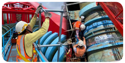 引進日本耐震技術,於管體既有伸縮管外部直接加裝伸縮拉桿及補強套管工法進行功能改善,提升水管橋耐震能力