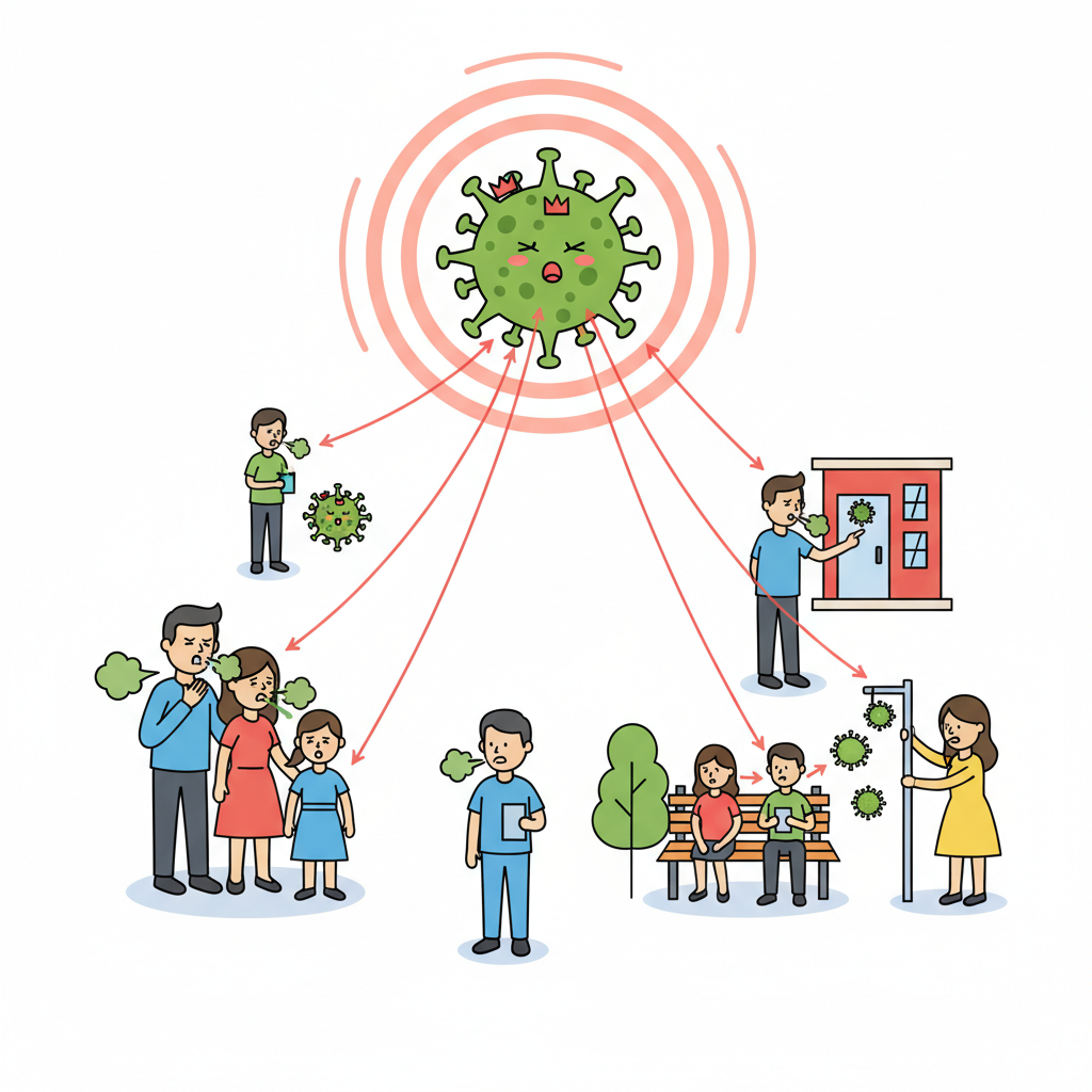 人口密集、接觸頻繁,使病毒容易迅速於社區與公共場所傳播。
