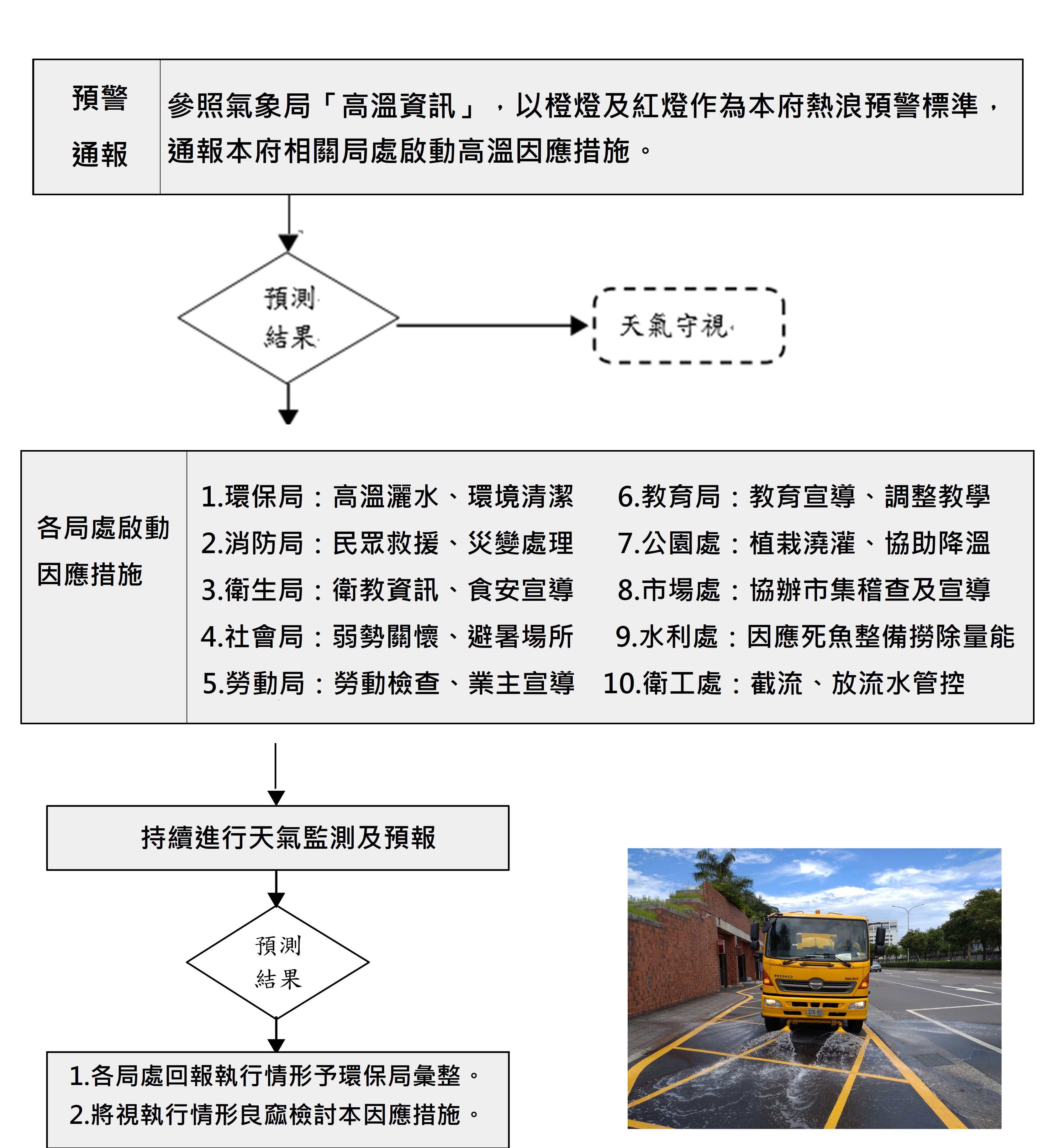 以橙燈及紅燈作為本府熱浪預警標準,通報本府相關局處啟動高溫因應措施。
